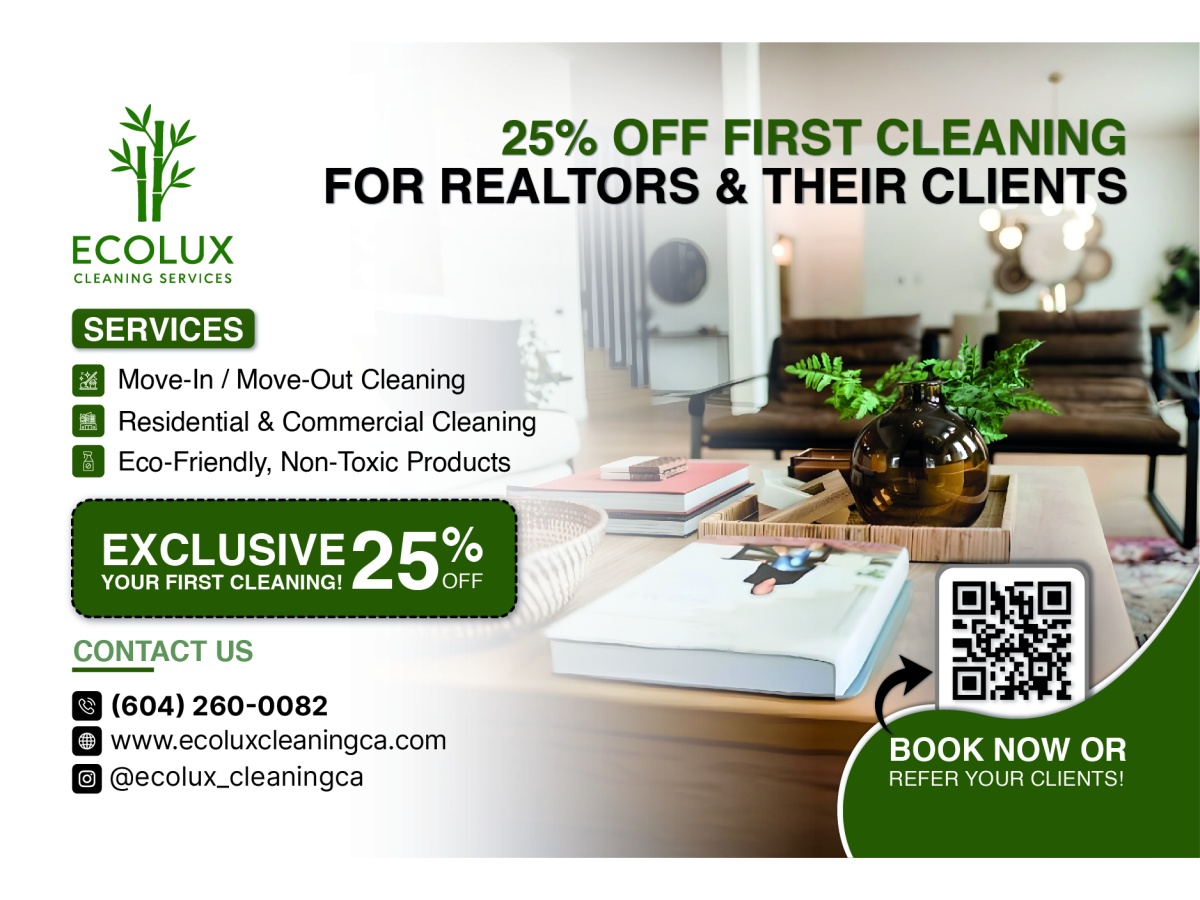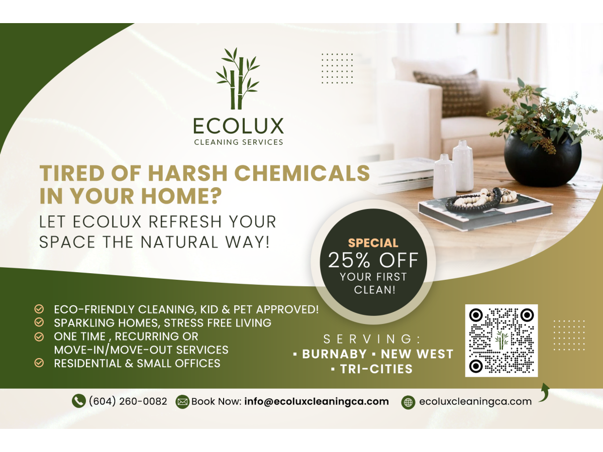 Ecolux Cleaning Services is a newly established company backed by over 10 years of professional cleaning experience. We specialize in eco-friendly residential, commercial, and Airbnb cleaning, serving clients across Vancouver, Burnaby and nearby areas. Our team is dedicated to delivering reliable, detailed, and environmentally safe cleaning solutions tailored to your needs. With flexible scheduling and a commitment to quality, Ecolux is the smart choice for a cleaner, healthier space.